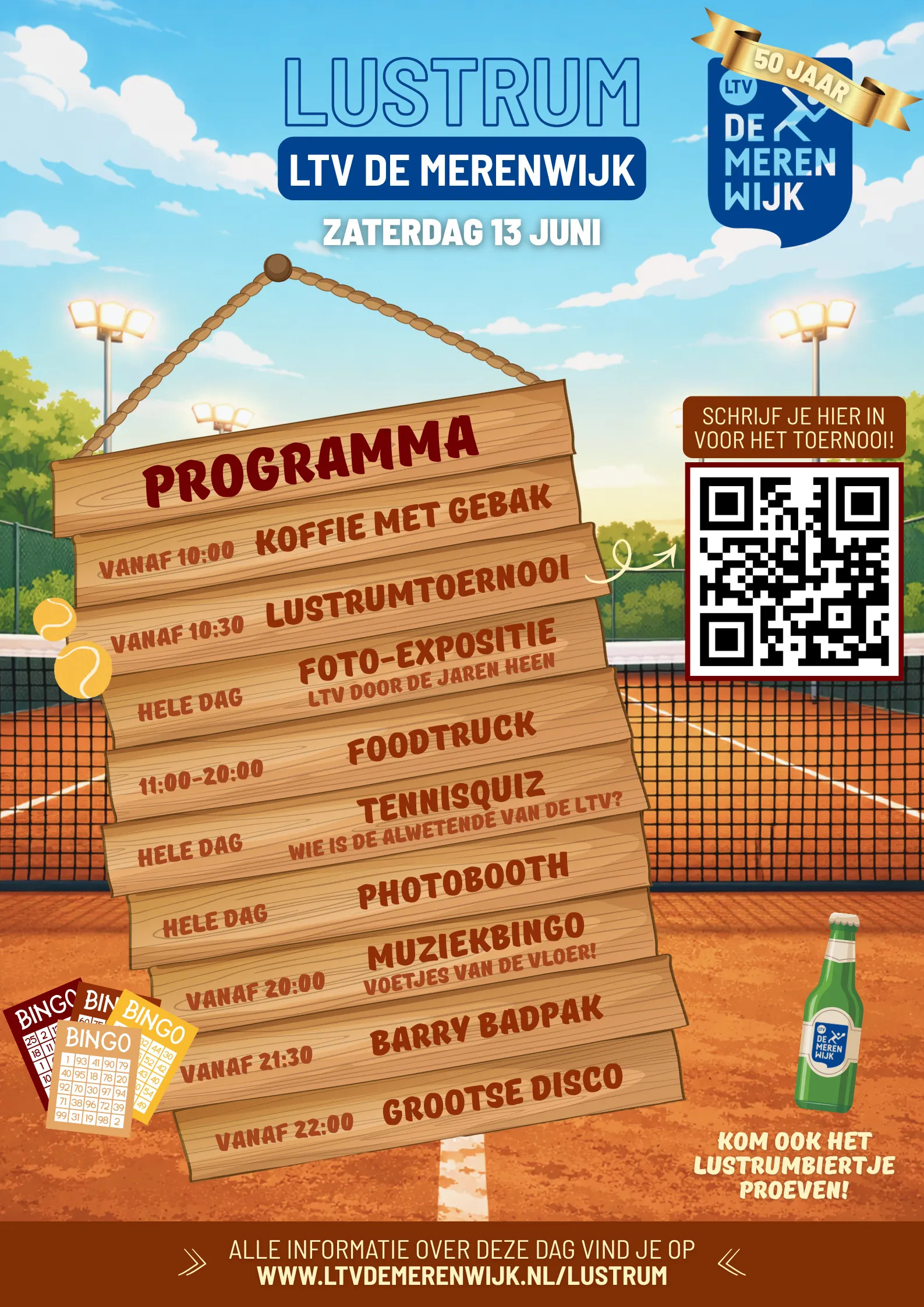 Om 16.00 uur heffen we met alle leden het glas op 50 jaar tennis in de Merenwijk, uiteraard zijn de oud-leden hiervoor ook uitgenodigd. Geen uitnodiging ontvangen? Geen probleem we zien u graag. Ook zetten we een aantal leden in het zonnetje voor hun inzet door de jaren heen.